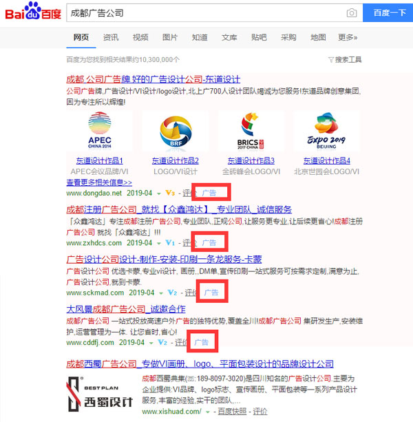 上圖以搜索“成都廣告公司”這一關(guān)鍵詞為例,前面四條都屬于廣告,區(qū)分是不是廣告推送可以從紅色標(biāo)記部分進行區(qū)分,后面沒有“廣告”二字的就是正常內(nèi)容可以放心點擊查找心儀的廣告公司進行合作啦。