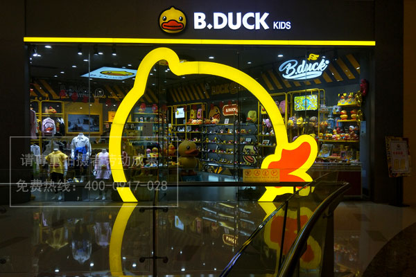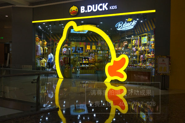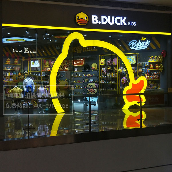 B.Duck kids小黃鴨因?yàn)楫a(chǎn)品超可愛所以受到廣大客戶的喜愛,所以在很多的商場(chǎng)都會(huì)有兒童潮牌實(shí)體店的入駐,其門店裝飾、店面招牌設(shè)計(jì)門頭發(fā)光字制作方面都特別的新穎。