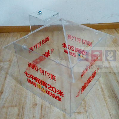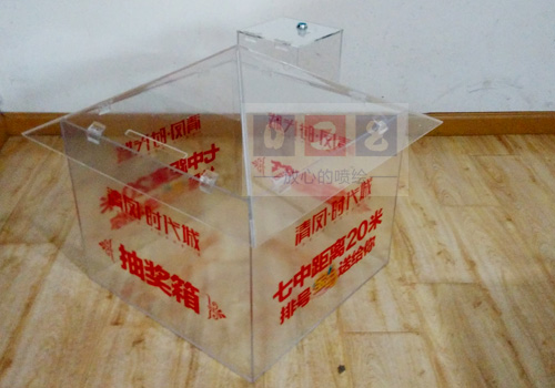 亞克力抽獎箱將亞克力雕刻形狀進行絲印,然后將各個亞克力用粘結劑粘結成型??芍谱鞒龈鞣N不規(guī)則立體圖形。